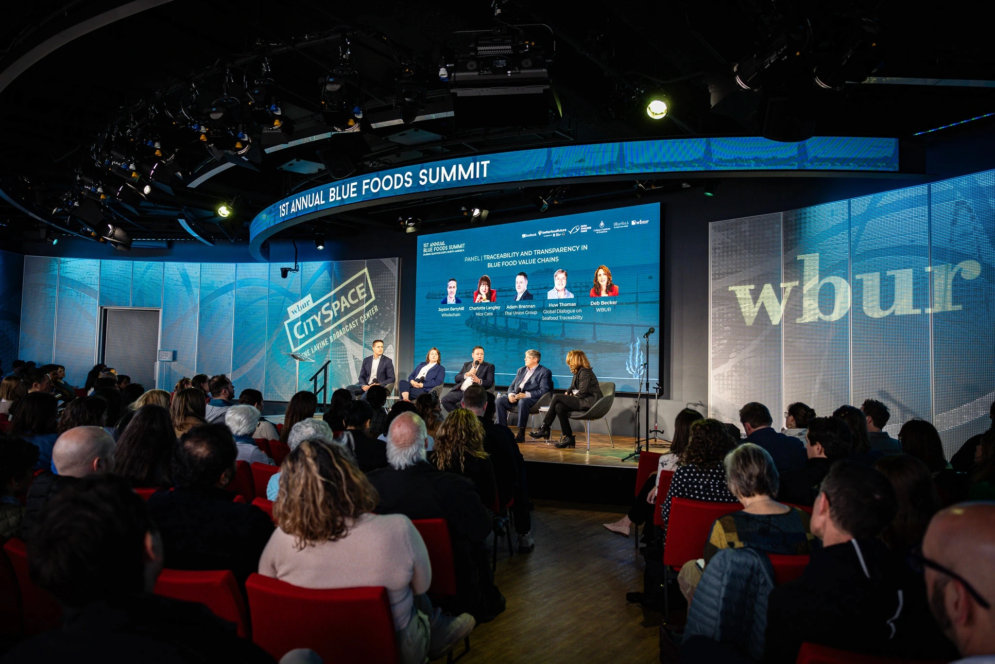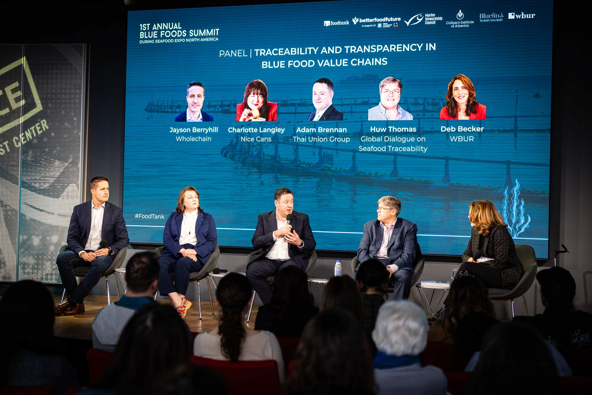 The panel brought together Huw Thomas (Global Dialogue on Seafood Traceability “GDST”), Adam Brennan (Thai Union Group), Charlotte Langley (Nice Cans), and Wholechain’s CEO, Jayson Berryhill (Wholechain), moderated by Deb Beck (WBUR). The conversation covered a wide range of perspectives, from global standards supported by large seafood distributors to on-the-ground realities for fishers and brands.